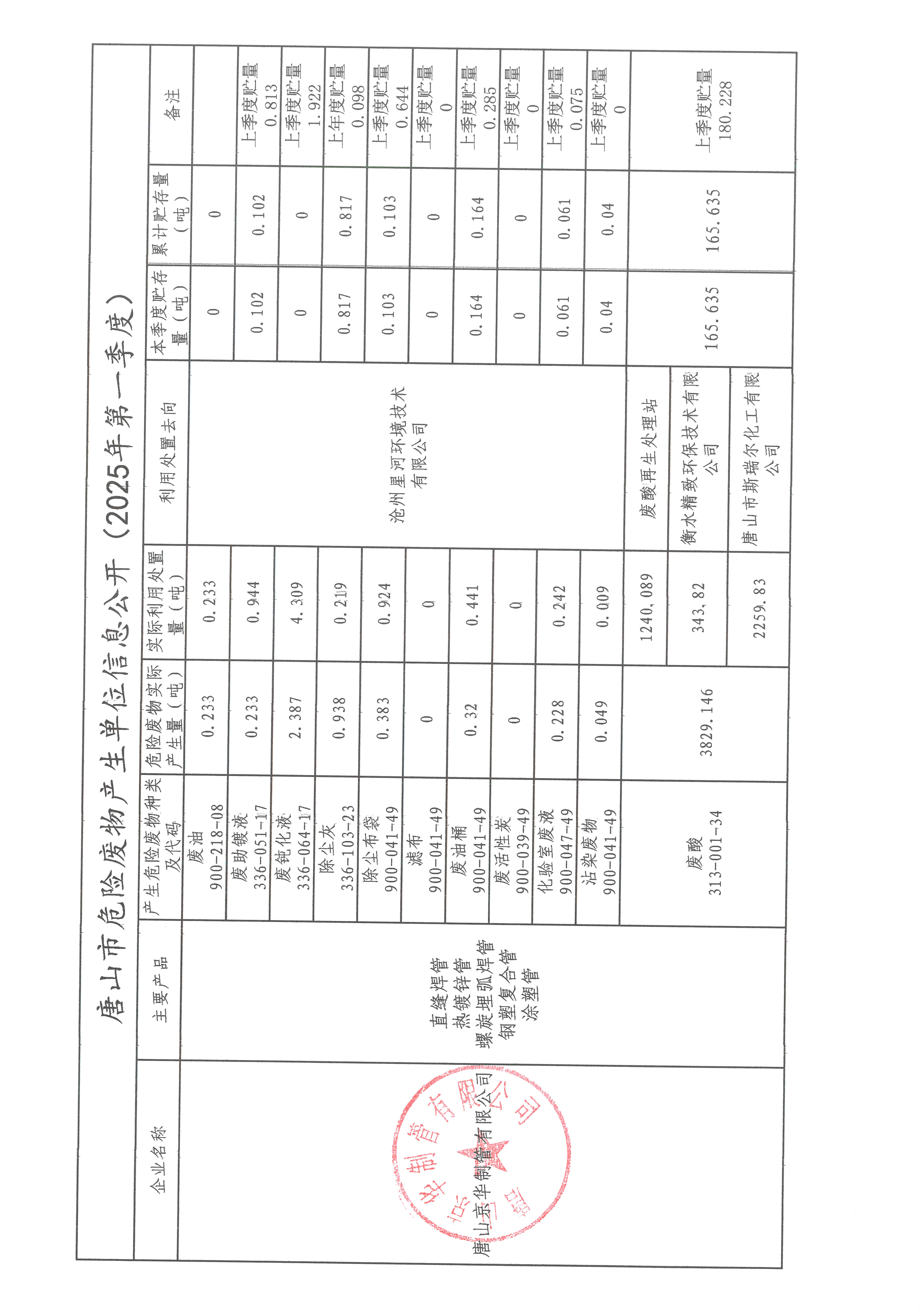 唐山京華制管有限公司2025年第二季度信息公開