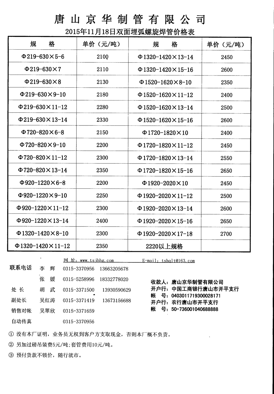 唐山京華2015年5月21日焊管價(jià)格表(長度為5.95、6米最低出廠限價(jià)、檢斤價(jià))