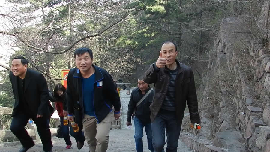 爬山活動(dòng)開(kāi)始了。一段依山棧道,令攀登者興奮不已。一路上,梨花白、桃花艷,李花濃,一片盎然春景。拾階而上,漸入山中。不見(jiàn)寺院,耳中卻傳來(lái)誦讀經(jīng)文的聲音,寂靜中給人帶來(lái)一種空靈的感覺(jué),使人頓覺(jué)遠(yuǎn)離城市喧囂的淋漓。棧道的另一端是一段坡度很大的石階,大家剛剛放松的心情又一次緊張起來(lái)。剛才還有說(shuō)有笑,現(xiàn)在一個(gè)個(gè)都嚴(yán)肅起來(lái),每個(gè)人都關(guān)注著自己的腳下,生怕有半點(diǎn)閃失。舒緩的石階同樣舒緩了人的心情,累了,可以坐在小亭里任清風(fēng)吹去汗意,舉目遠(yuǎn)眺,群山連綿起伏在薄霧中。忽然,上面?zhèn)鱽?lái)渾洪的鐘聲,已經(jīng)有人到了山頂。接近山頂,財(cái)神廟、狐仙洞、黃仙洞、知止洞讓你目不暇接,“莫道君行早,還有早行人”的古訓(xùn)又使人加快了向上的步伐。大家一鼓作氣爬到山頂,俯視腳下,山洼里的果樹(shù)花開(kāi)的正濃,一片白一片紅,大家在享受優(yōu)美自然景色的同時(shí),也不忘留影紀(jì)念。